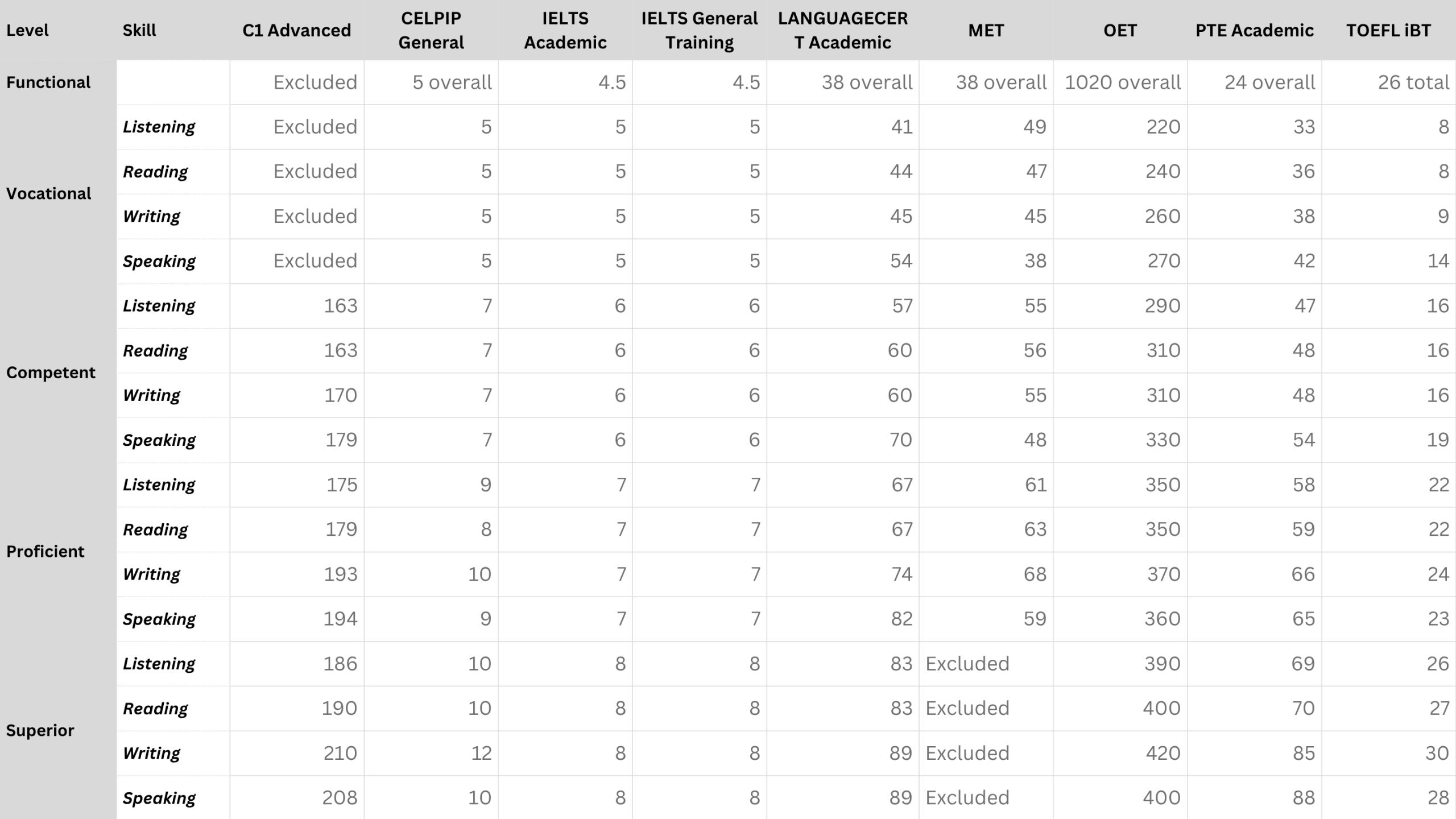 English Level | IELTS | PTE | TOEFL iBT | Cambridge C1 | OET |
